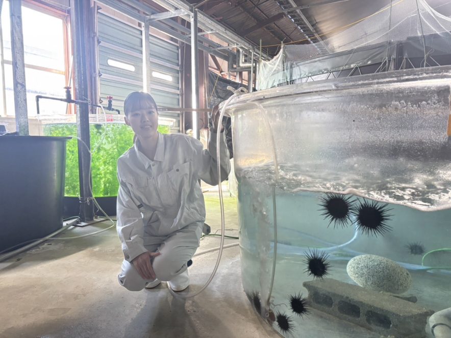 今回、渡部さんが担当しているムラサキウニの研究について、実際の試験場で見せていただいた。