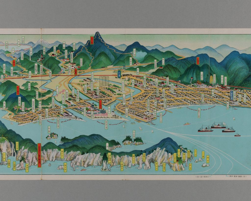 昭和8年に作られた「わかさ小浜(鳥観図)」にはすでに、お寺や旅館といった観光地とともに「八百比丘尼入定洞」の位置が示されており、鉄道路線も明瞭に描かれている。