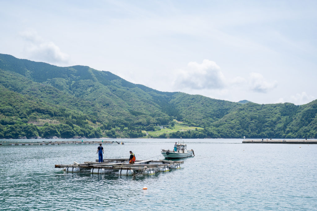 久しぶりに訪れた田烏の釣姫漁港。平日にも関わらず、堤防にはたくさんの釣り人。海に近づき水面を覗くと、小さな魚がたくさん泳いでいた。この日は、新しく着任した水産事業者を目指した地域おこし協力隊の取材。「養殖業の勉強をしたくて小浜に来ました」と、高校卒業してすぐの若々しさ溢れる言葉に感動していると、堤防に人が集まってきた。