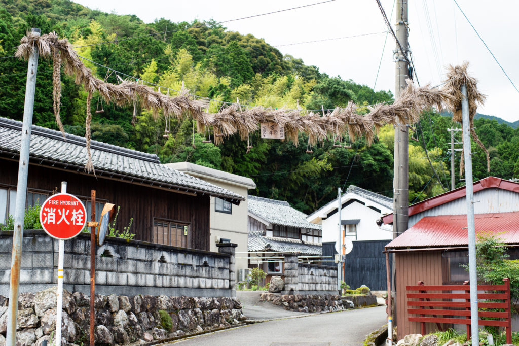 大下さんの作った掲示板をよく見ると、木材やアクリルの角が丸く整えられていたり、掲示板の高さをねじ込みで調整できるようになっていたり、所々に使い手のことを考えたアイデアと思いやりがうかがえる。さすが寝る間を惜しんで考えられた製品だ。「自宅にも手作りしたものがたくさんあるよ。ちょっと見ていく?」お言葉に甘え、大下さんの作品を見せてもらいに、お宅へ向かった。その道すがら、地区の入り口となる通りにしめ縄のようなものが吊るされていた。「それは、六日講の飾り」大下さんは自宅の庭から教えてくれた。六日講とは一年の豊作を祈る地区の風習。よく見ると、ただのしめ縄ではなく所々に短い木がぶら下がり、何かを形作ったような飾りがある。