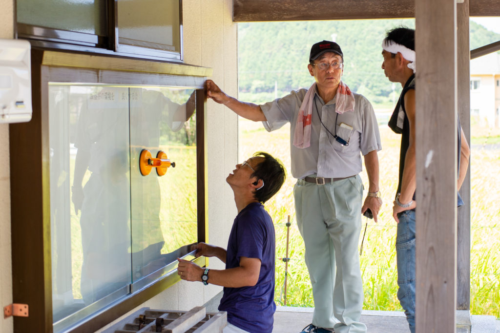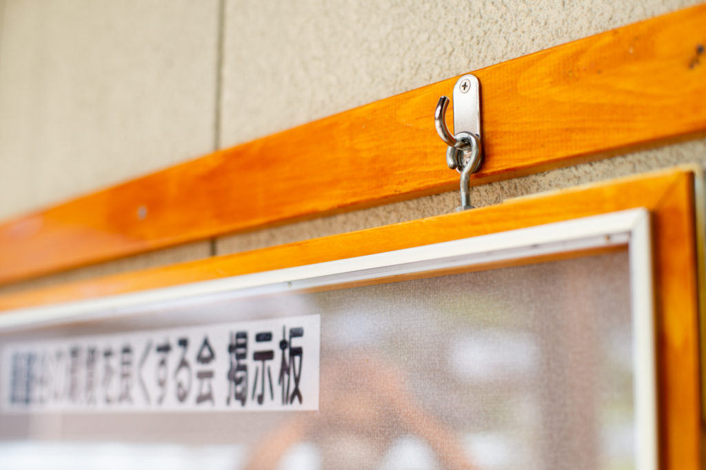 「自分は地域の便利屋さんですから」愛らしい笑顔でそう話すのは、大下光彦さん。木材に金具を素早く打ち付け、木材の水平をさっととり、あっという間に「法海集落センター」の壁には掲示板が付いてしまった。「手を動かすの好きやから、家の直しも全部自分でやっちゃう。でもね、この掲示板、大袈裟じゃないけど寝ないで構造を考えたの。こうやって現場で設置するのは一瞬だけど何十時間かかっているか分からんよ」と、作業しながら饒舌に説明してくれた大下さん。元々は電動工具などの実演販売もされていたとのこと。工具の扱いや説明がプロ並みなのも納得だ。