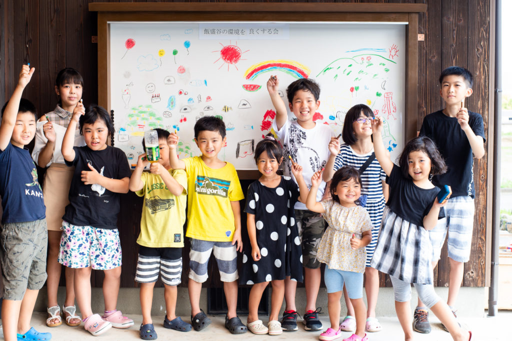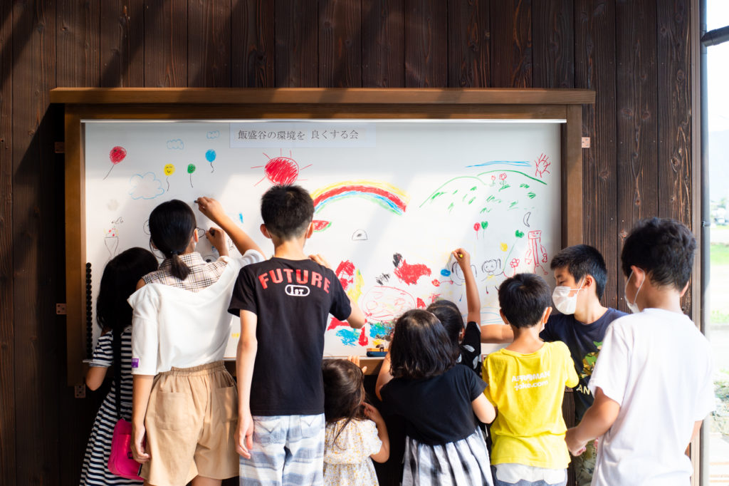 「この後、子どもたちには、将来の飯盛地域を画用紙に描いてもらいたいと思っています。そして、この掲示板に順番に貼っていくんです。きっと、そんな絵を大人たちも見たいでしょ」と、掲示板に夢中に絵を描く子どもたちを見つめて地村さんは話してくれた。
