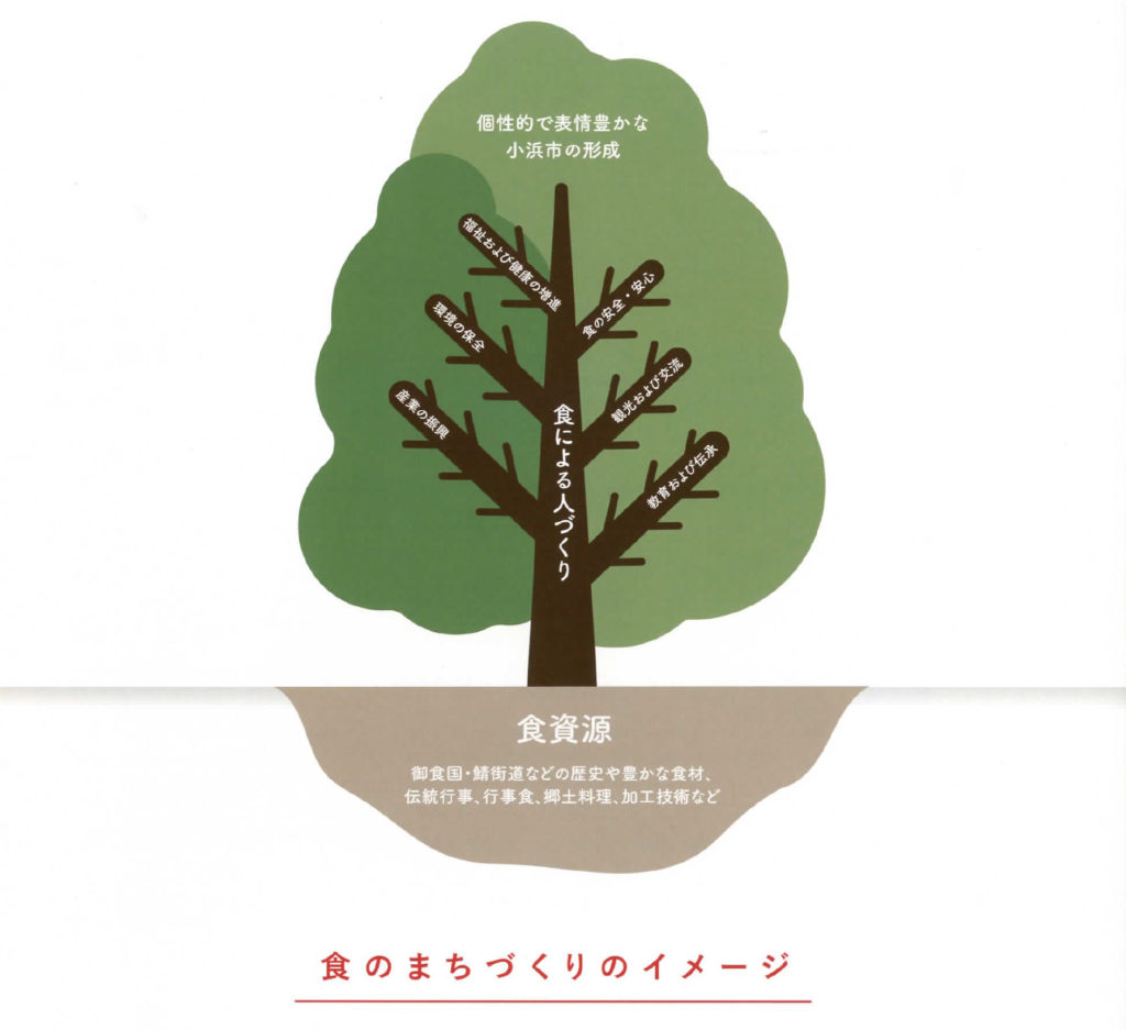 「私達は、小浜市の様々な食資源を栄養にして大樹を育てています。それが食のまちづくりのイメージです。木の幹には、「食による人づくり」があり、その幹から、産業の振興、環境保全、福祉及び健康の増進、教育及び伝承、観光及び交流、食の安全安心などの枝が伸び、さらに、それぞれの枝に具体的な事業の小枝が伸びていきます。