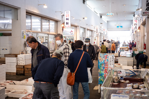 魚市場で仕入れた採れたての海産物がずらりと並ぶ小浜の台所。12の鮮魚店が軒を連ねる食材豊かな小浜を象徴する賑やかな市場です。四季折々の鮮魚はもちろん、各店独自の干物や加工品などもお楽しみいただけます。