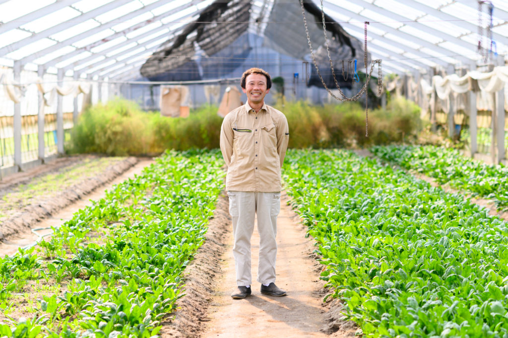 小さな頃から父親の農業する姿を見てきて、自分が農家になることを疑ったことはありません。砂のようなサラサラとした土でつくるふかふかの農地は、もみがら堆肥をふんだんに使っています。この自慢の土が、えぐみがなく甘い野菜たちをキレイに育ててくれます。ほうれん草や菊菜などの葉物野菜を中心に、季節に沿った様々な野菜と毎日一緒に生きています。