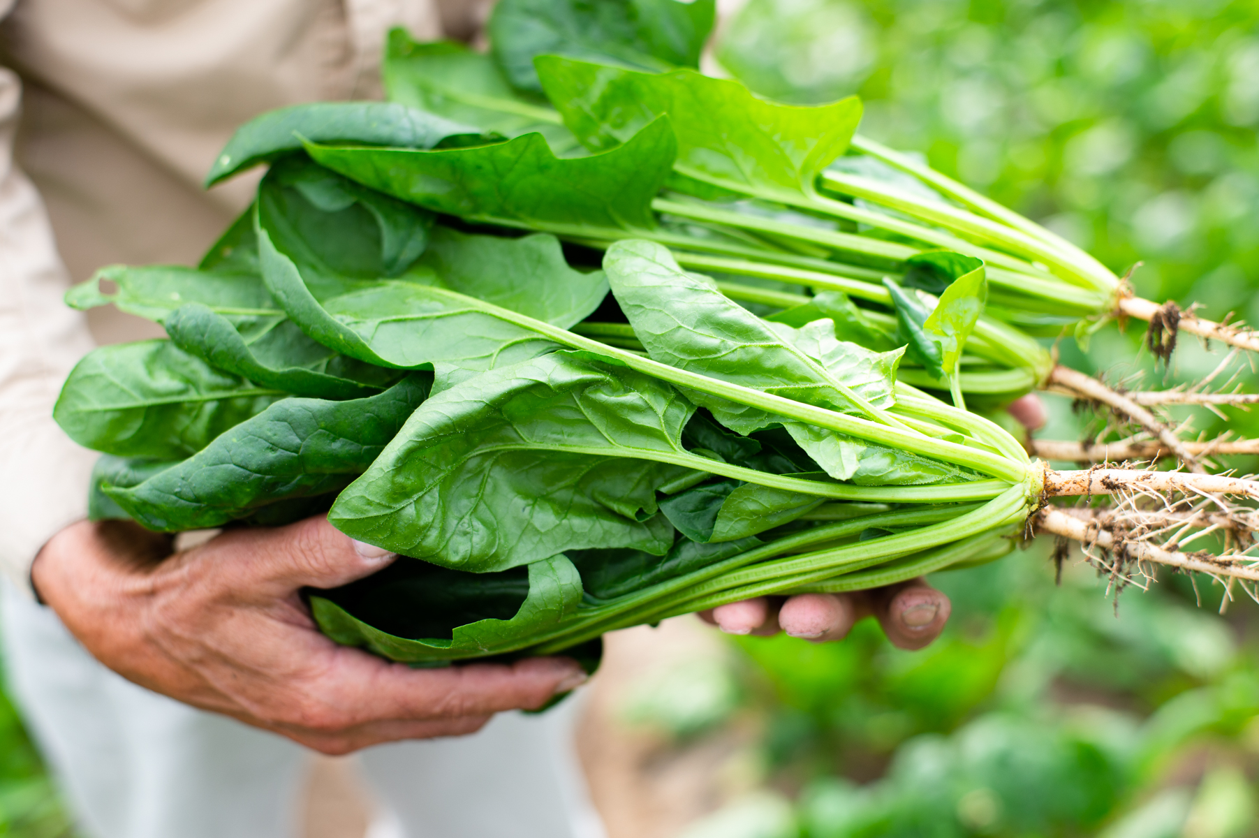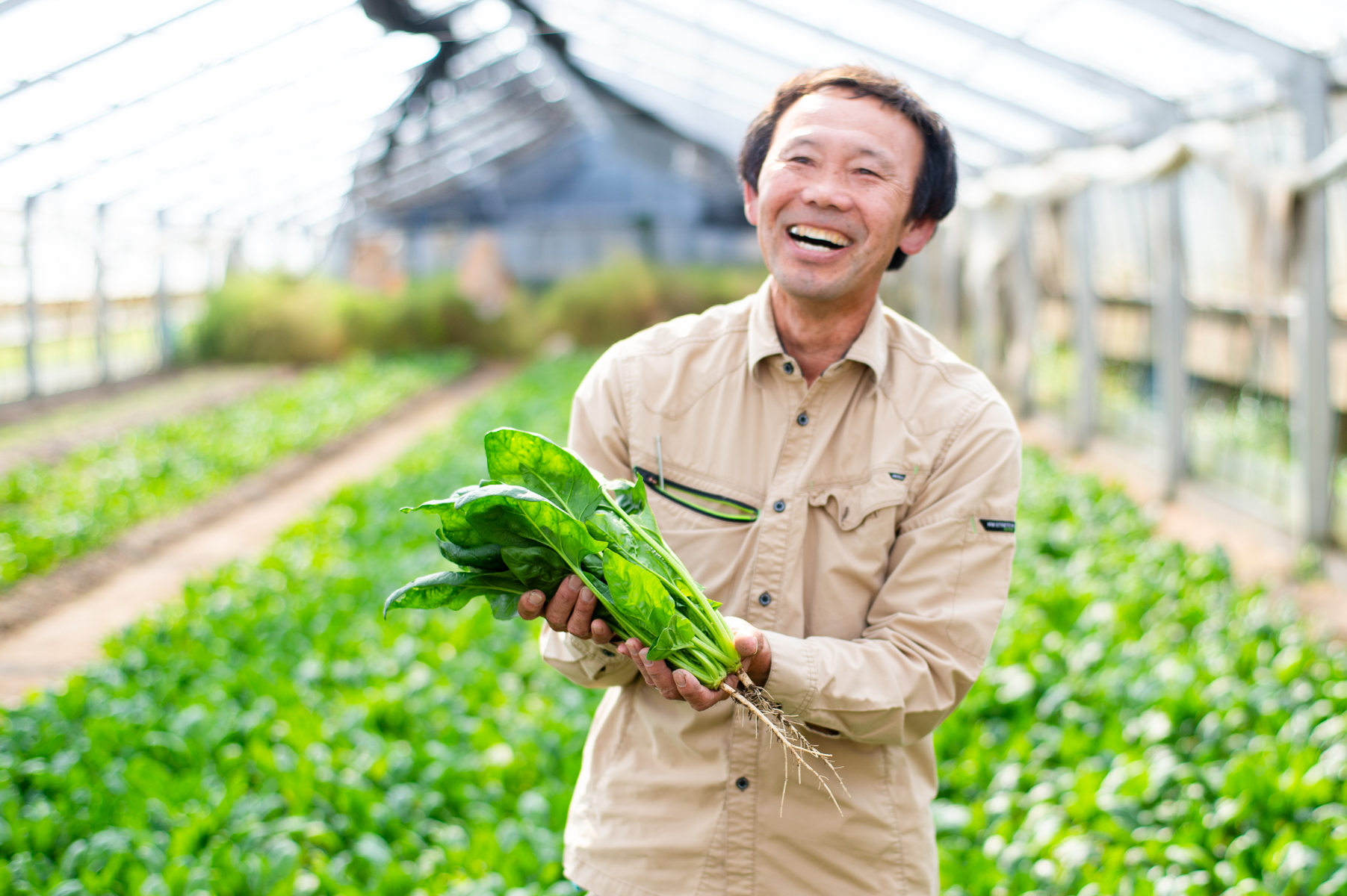 小さな頃から父親の農業する姿を見てきて、自分が農家になることを疑ったことはありません。砂のようなサラサラとした土でつくるふかふかの農地は、もみがら堆肥をふんだんに使っています。この自慢の土が、えぐみがなく甘い野菜たちをキレイに育ててくれます。ほうれん草や菊菜などの葉物野菜を中心に、季節に沿った様々な野菜と毎日一緒に生きています。
