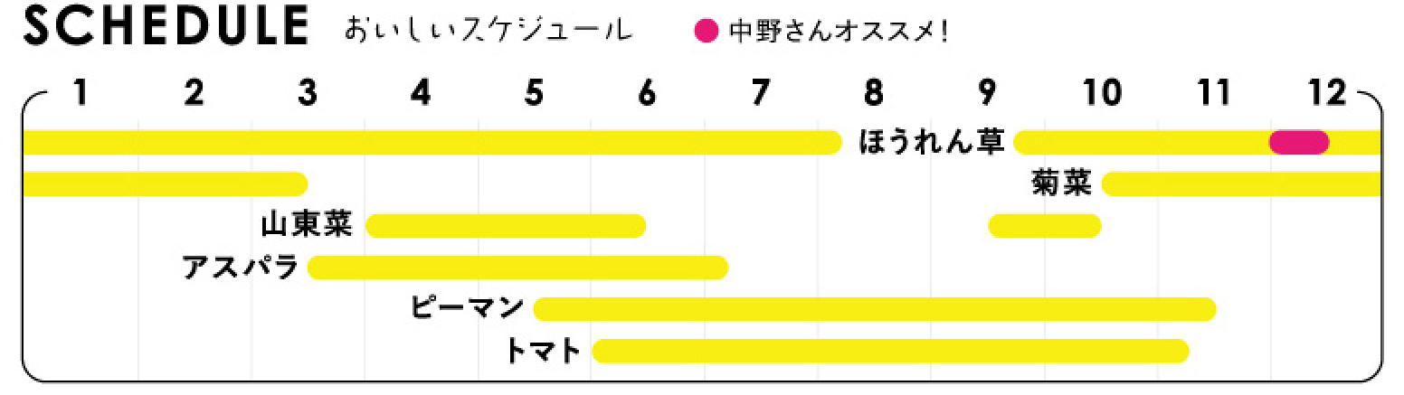 ほうれん草・菊菜・山東菜・小松菜・ピーマン・甘長・アスパラ・かぶ・トマト