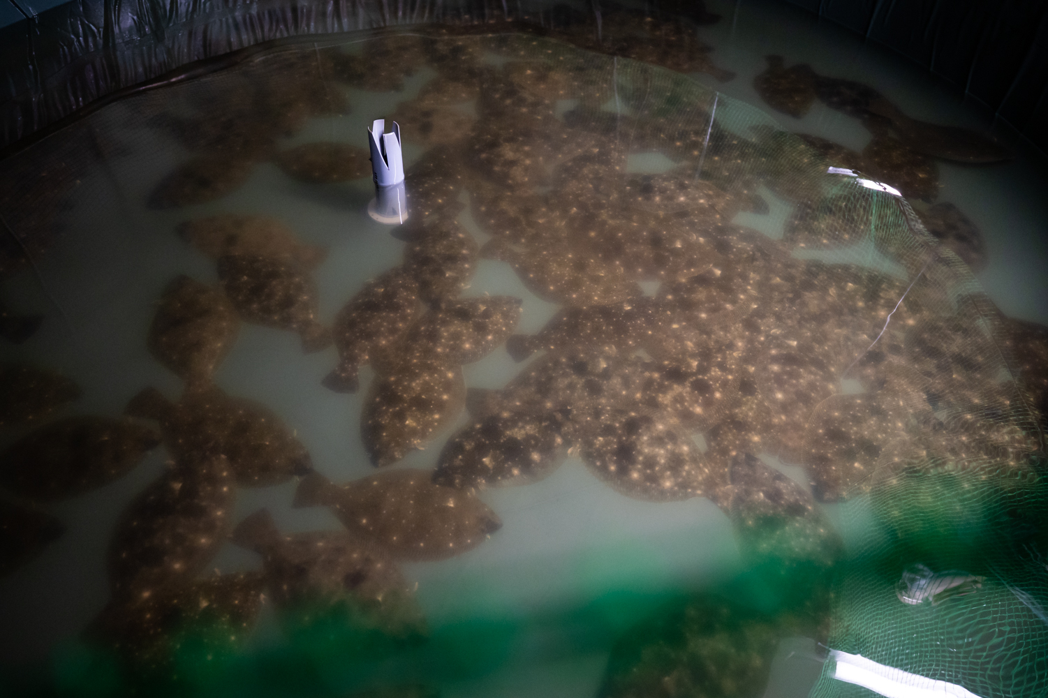 水産加工会社 小浜海産物が初めて挑戦する陸上養殖事業として、2019年から「八百姫ひらめ」の養殖を開始しました。このひらめは、種苗(稚魚)から出荷に至るまで完全無投薬の、ほぼ無菌状態で養殖しているため、小さなお子さんからお年を召した方まで安心して食べていただけるオーガニック養殖魚です。一般的な養殖では脂乗りを重視しますが、自社配合の油分を控えた餌で育てることで、余分な脂乗りがなく引き締まった身の中に魚本来の甘みが感じられます。