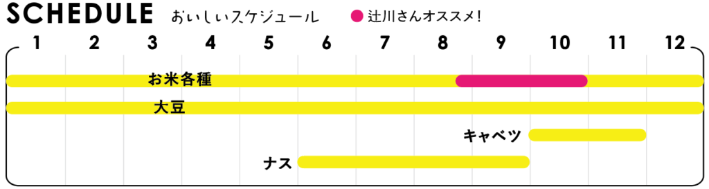 お米、大豆、キャベツ、ナス、白ネギ、かぶら、大根、白菜、レタス、じゃがいも、さつまいも、玉ねぎ、そば