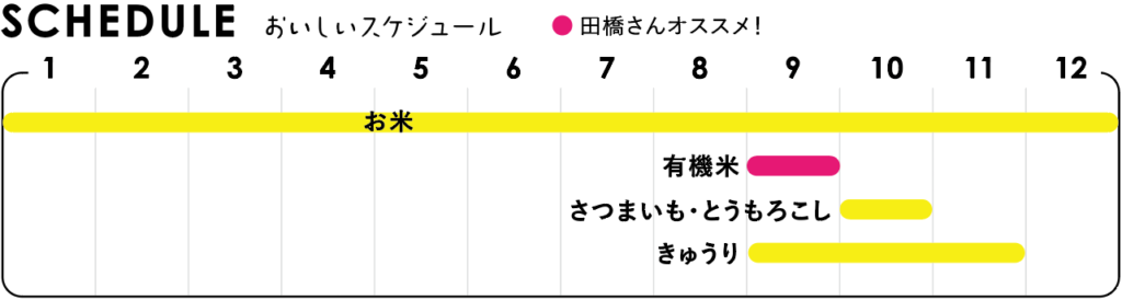 お米、有機米、さつまいも、とうもろこし、きゅうり