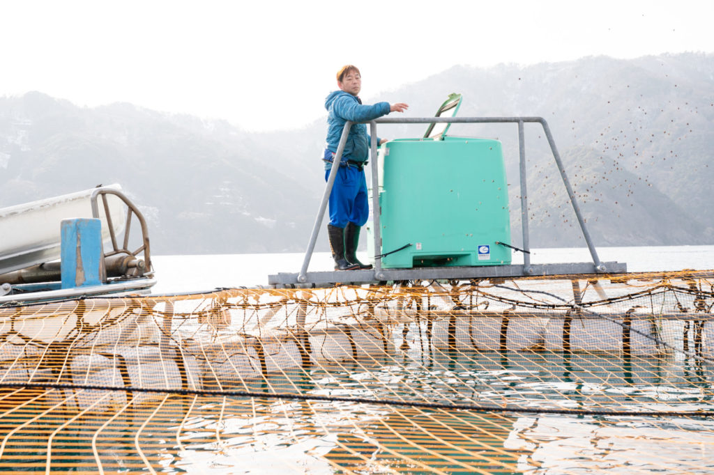 定置網漁業で培った技術を生かし、2017年度に西小川・宇久・加尾地区の漁師と「小浜市トラウトサーモン養殖振興協業体」を結成して、「ふくいサーモン」の養殖を始めました。小浜の文化や観光の基盤となる“魚”を自分は捕るのではなく、捕らされていると思うほど、最近では海に使命感を持って向き合っています。サーモン養殖も仲間とノウハウを蓄積させながら、良質な海の畑として新たな魅力づくりになるよう力を入れています。