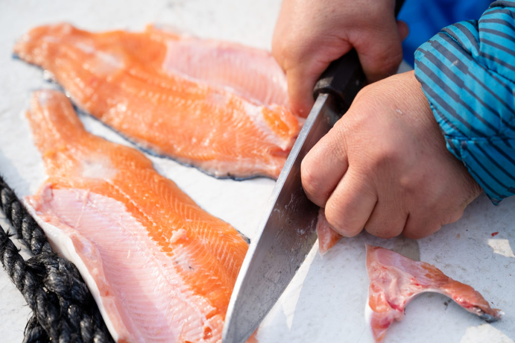 安心に育てられたサーモンなので生で食べる刺身やカルパッチョは、どこの産地にも負けないおいしさ!アラの石狩風鍋もうまいんですよ。