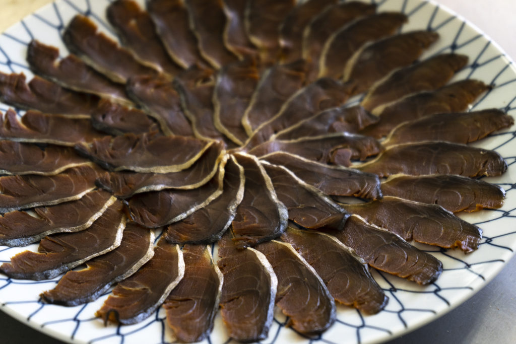 こだわり抜いた材量を使って1年間樽の中で熟成していくのだが、夏場の温度が高いほど、タンパク質がアミノ酸に分解され、旨味が引き立つとのこと。そして、よく熟成されたへしこは飴色になり、この色が目利きポイントとなる。