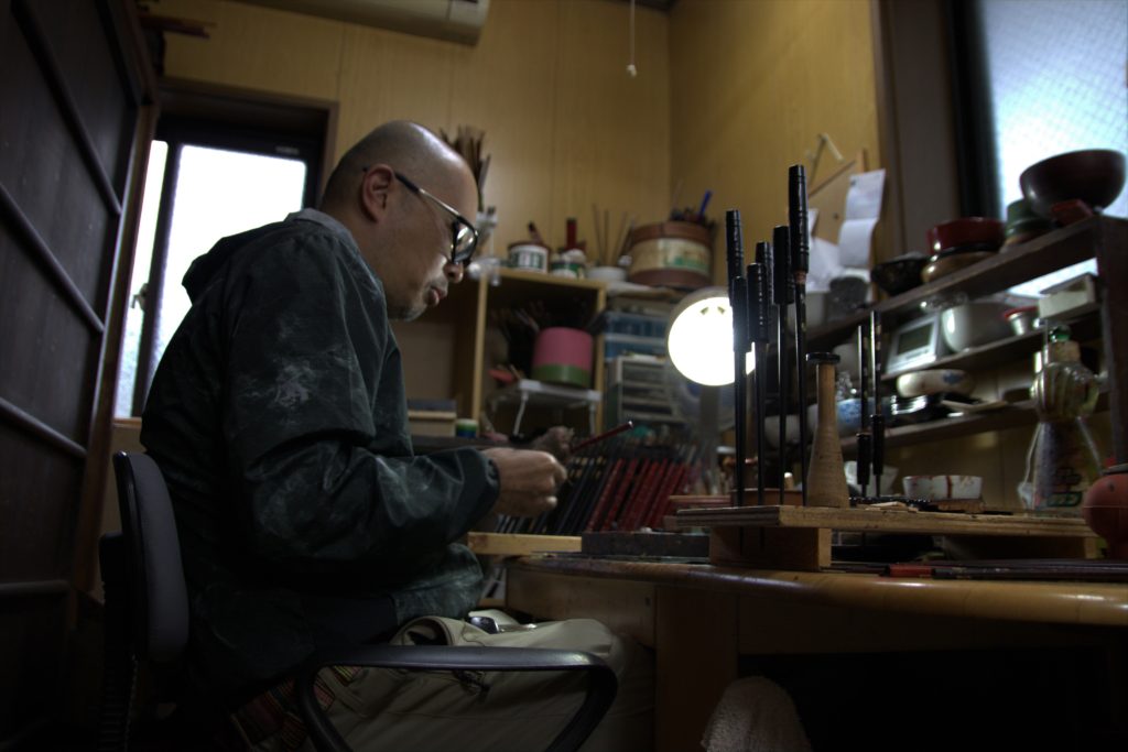 「出来上がるまでに大体1年くらいかかります」若狭塗の職人 加福宗徳(かぶくひろよし)さんは、私が持参した菓子道具を見てこう答えた。