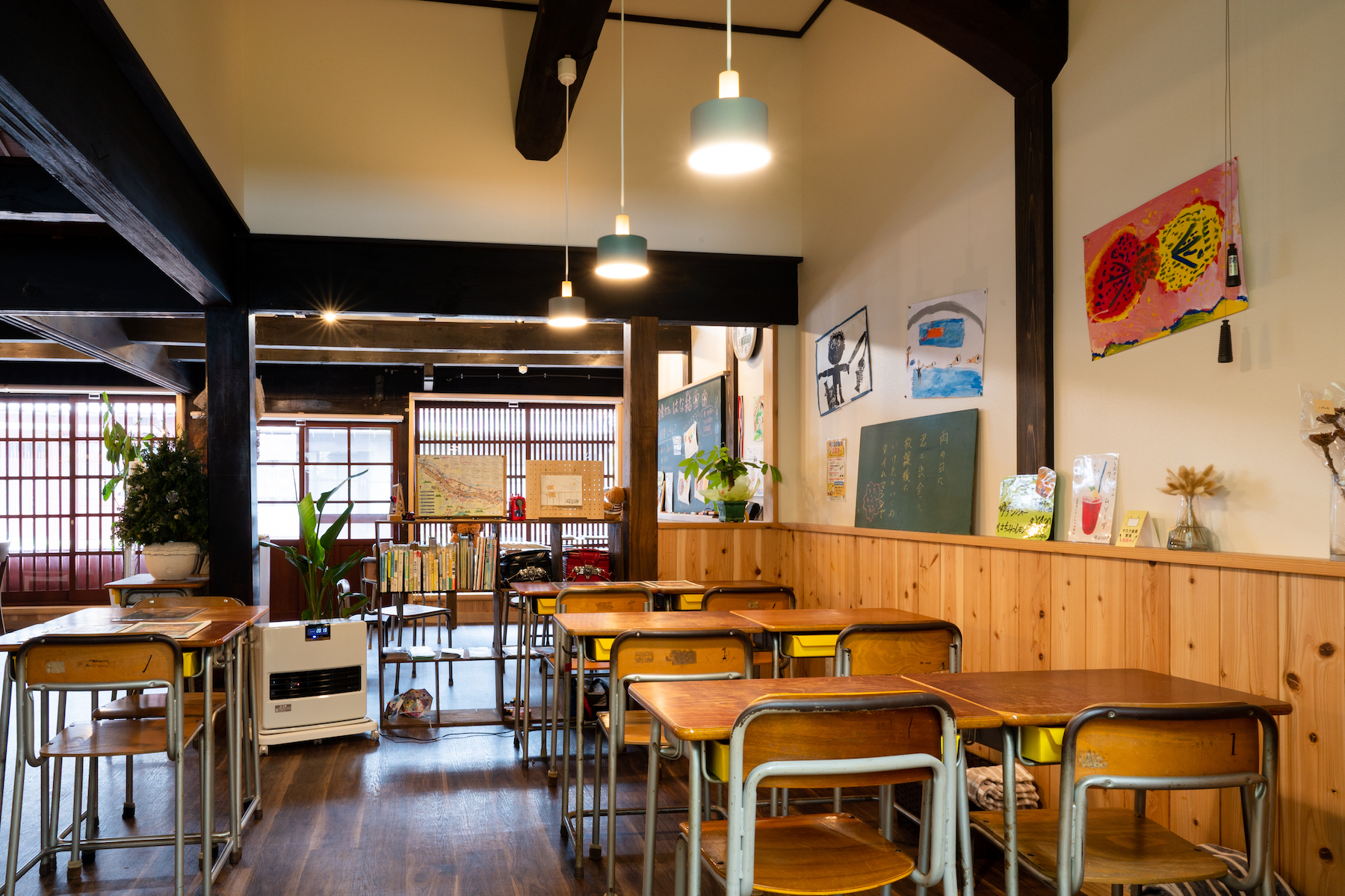 「鯖街道熊川宿」にある築160年以上の古民家を改装し、店内は懐かしい学校の教室風にリノベーション。人・食・地域を結ぶ「つながり」をテーマに、地場産物を活用した学校給食メニューを提供。献立は、実際に保育園や小中学校で勤務した元栄養教諭が作ります。花屋も併設し、ユニークな空間が楽しい。